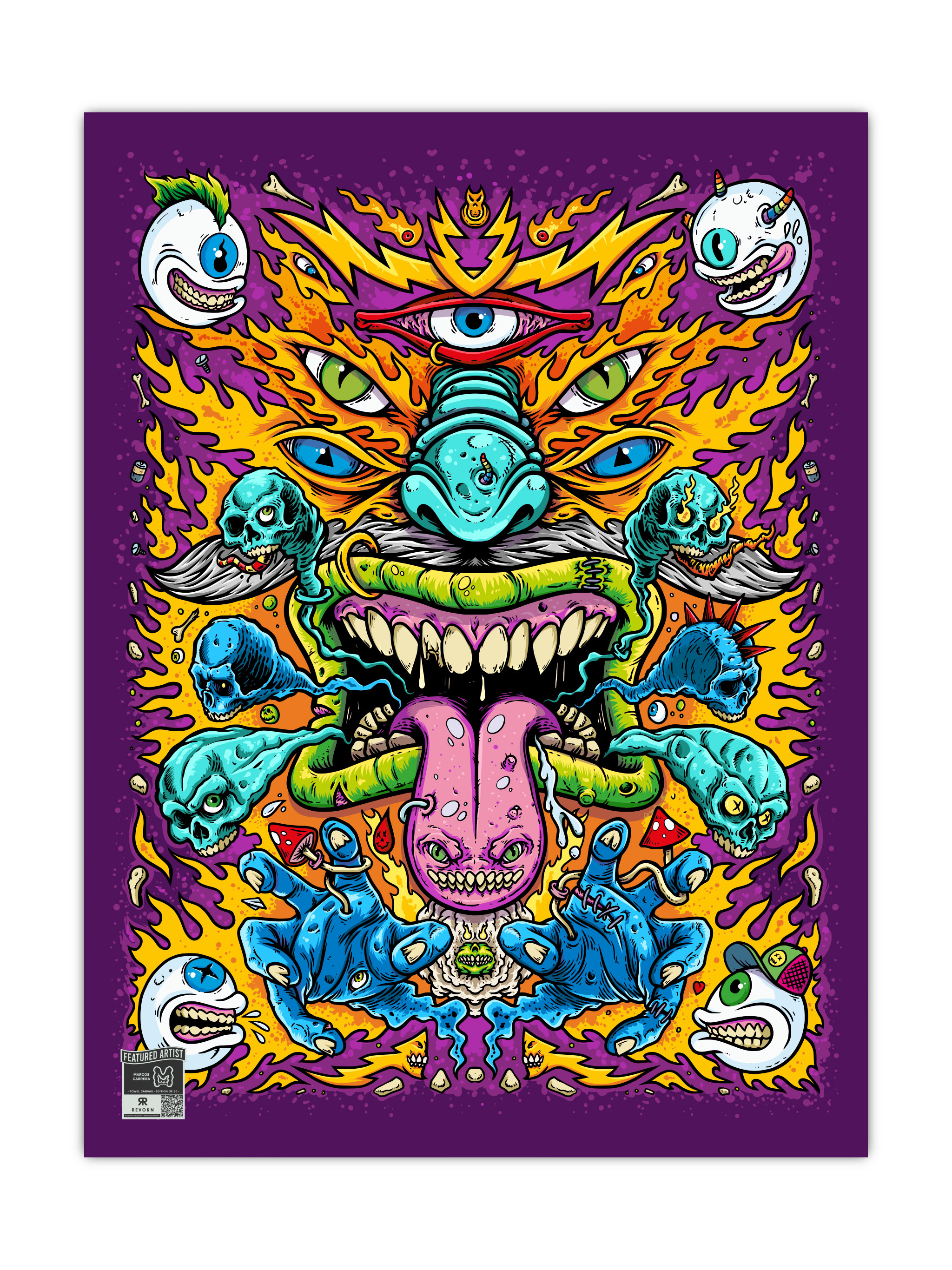 His work spans posters, skateboards, merchandise, and album covers—packed with surreal imagery and a deep fascination for monsters and the macabre.